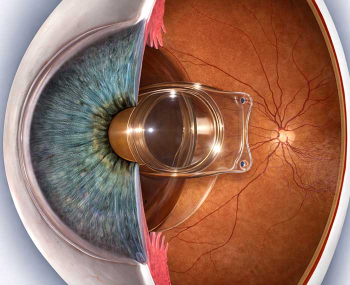 En esta cirugía, se implanta un lente dentro del ojo, en el espacio que hay entre la cornea y el iris ( Cámara anterior) o en el espacio que hay entre el iris y el cristalino ( sulcus).